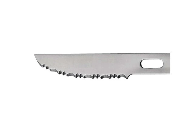 Robusto juego de cubiertos con un afilado cuchillo de sierra, un tenedor y una cuchara para su uso en la naturaleza. El set viene con una práctica funda de neopreno y un mosquetón. Fabricado en acero inoxidable, es muy duradero.