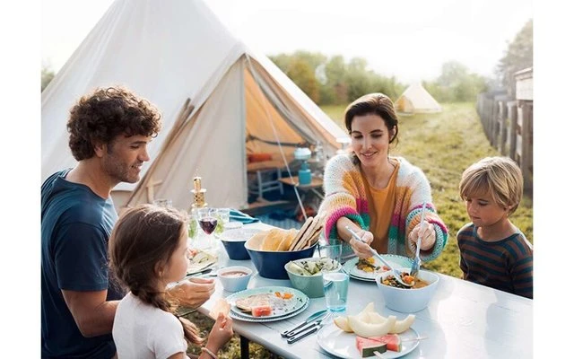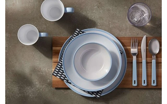 De este modo, la vajilla puede guardarse ahorrando espacio y es ideal para las vacaciones en camping, caravana o barco. La vajilla de camping Flow está disponible en diferentes colores y decoraciones y consta de varios platos, cuencos, tazas y vasos. Para unas posibilidades de combinación ilimitadas