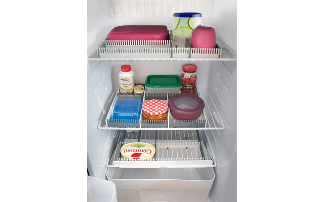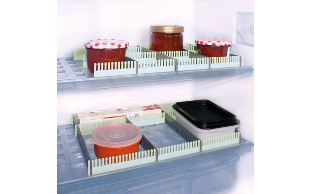El sistema enchufable consta de 8 raíles de estiba que conforman un inserto de compartimento variable. Los divisores largos y anchos de plástico flexible ofrecen una protección óptima contra la separación de los distintos artículos y, por tanto, estabilizan sus objetos a prueba de roturas y antideslizantes. En la parte superior y larga de la repisa de almacenamiento hay muchas púas que, con sólo conectarlas, crean una conexión estable y firme. Las púas muy espaciadas permiten un ajuste flexible a casi cualquier distancia. Adecuado para alimentos de todo tipo, recipientes de almacenamiento, tarros de conserva,